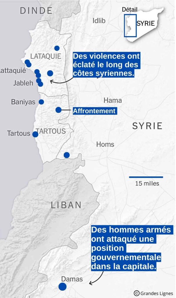 Les violences se concentrent dans les provinces côtières de Lattaquié et Tartous, sur les rives de la Méditerranée. Autrefois considérée comme un bastion du régime de Bachar al-Assad, cette région est historiquement dominée par la minorité alaouite, une branche du chiisme à laquelle appartient la famille Assad. Pendant plus de cinquante ans, cette communauté a occupé les plus hauts échelons du pouvoir et de l’armée syrienne.